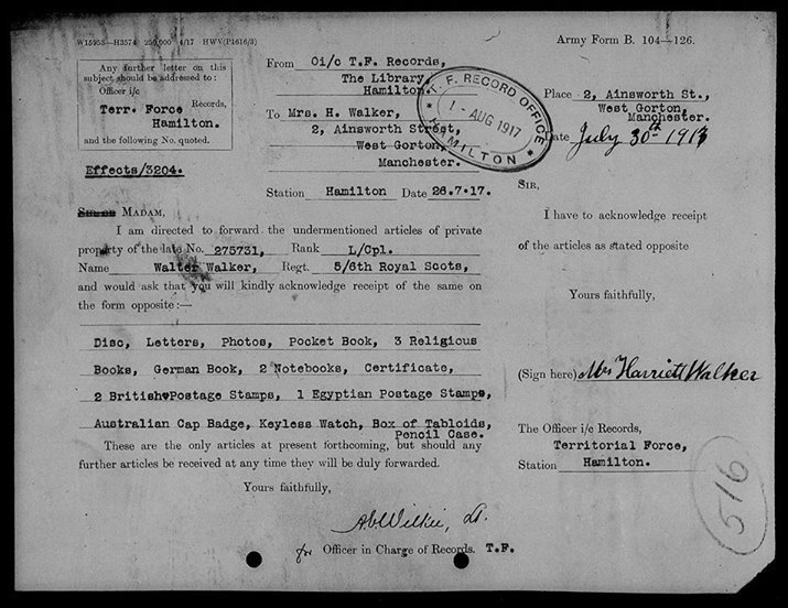 Walter Walker (an uncle of my dad, also Walter Walker) enlisted in the army in 1915, aged 17 (he told them he was 19). He was killed in action in France on 14 April 1917. The image shows one of several documents, found when researching the family tree, that deal with the ‘admin’ of his death. Another form sent to his mother, Harriett, asked her to choose a personal inscription for his gravestone in the war cemetery in France (We Shall Meet Again).